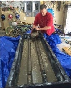Apply concrete release agent inside the reusable form. Set the rebar, tomato stakes, J-bolts, and tie wire according to the reinforcement plan before pouring.