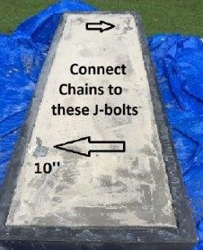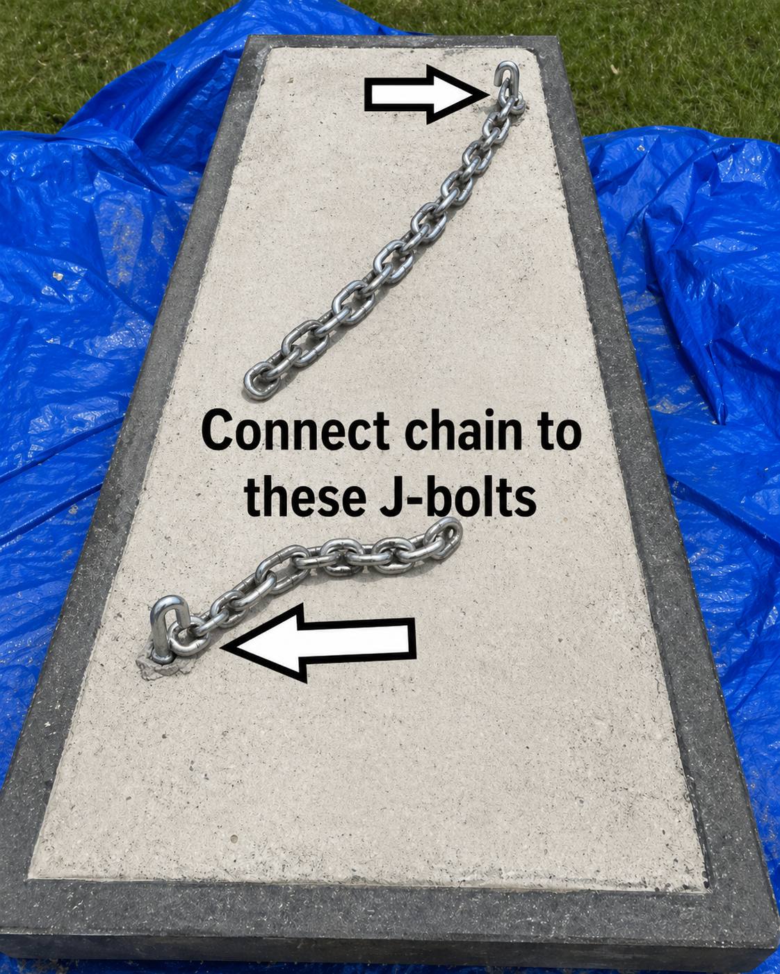 While the concrete is still plastic, insert the J-bolts at the designated anchor points. Check alignment and depth before the concrete sets. Allow the concrete to cure undisturbed before removal.